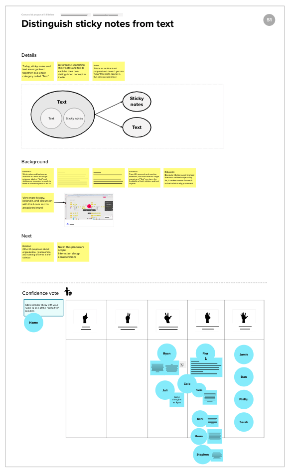 Closer look at one of the proposals, with its confidence vote “fist to five” activity.